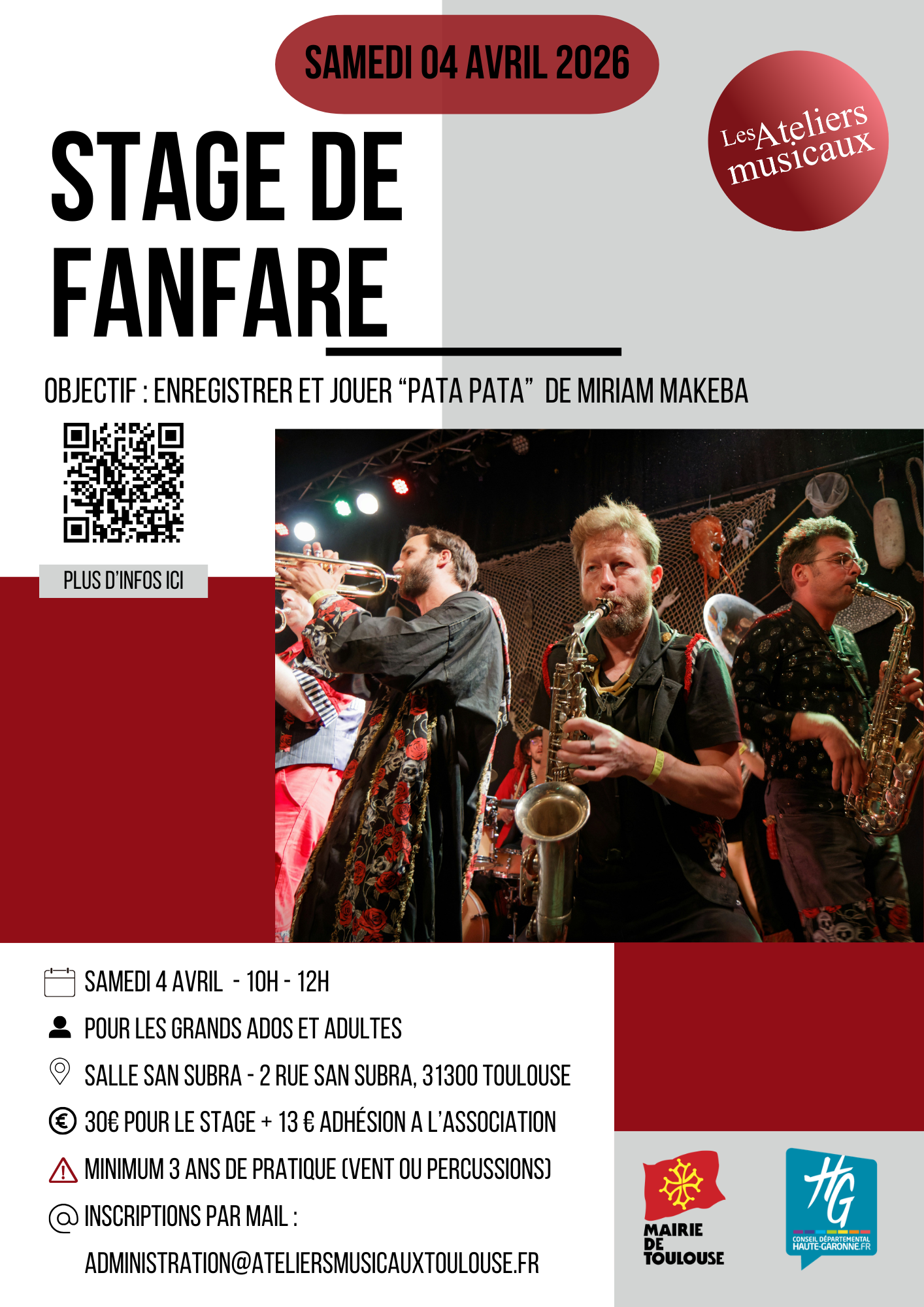 Venez participer à notre stage de fanfare le samedi 04 avril 2026, salle San Subra de 10h à 12h. 2h pour monter et enregistrer un morceau.
